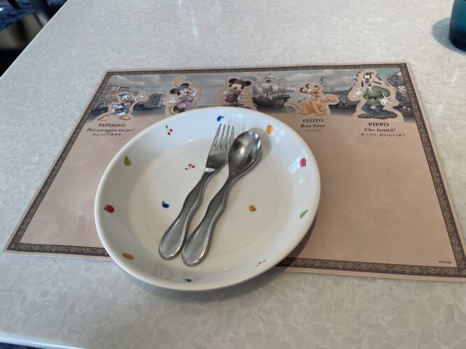 席には子ども用の紙のランチョンマットとカトラリーが用意されており、紙エプロンもいただけます。